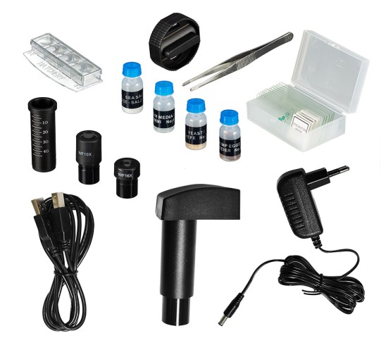 Mikroskop je dodáván s bohatou výbavou. Výbava obsahuje vše, co je potřeba k provádění zajímavých pokusů s mikroskopem. V balení najdete hotové preparáty, sklíčka a výbavu pro výrobu vlastních preparátů, lahvičky na vzorky atd. Součástí je také plastový obal, který chrání mikroskop před prachem. Součásti není kufr, mikroskop je uložen do polystyrénu.